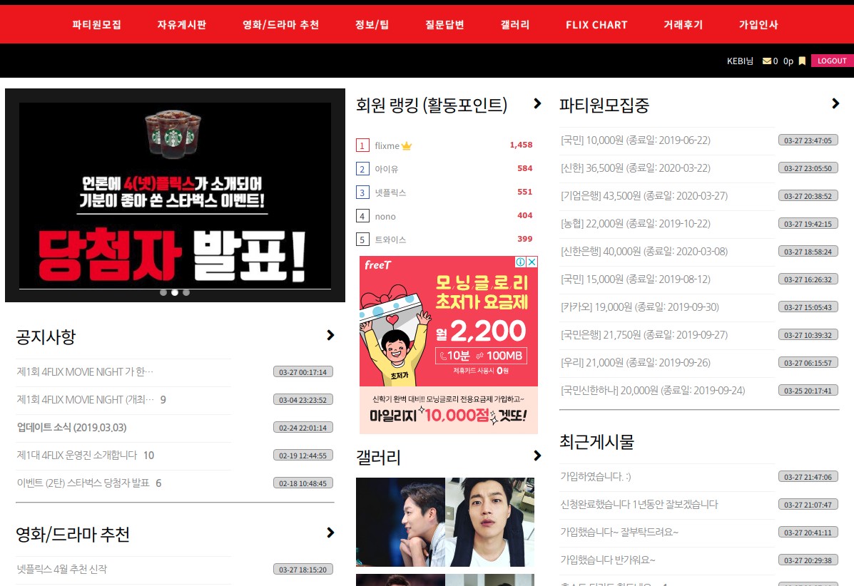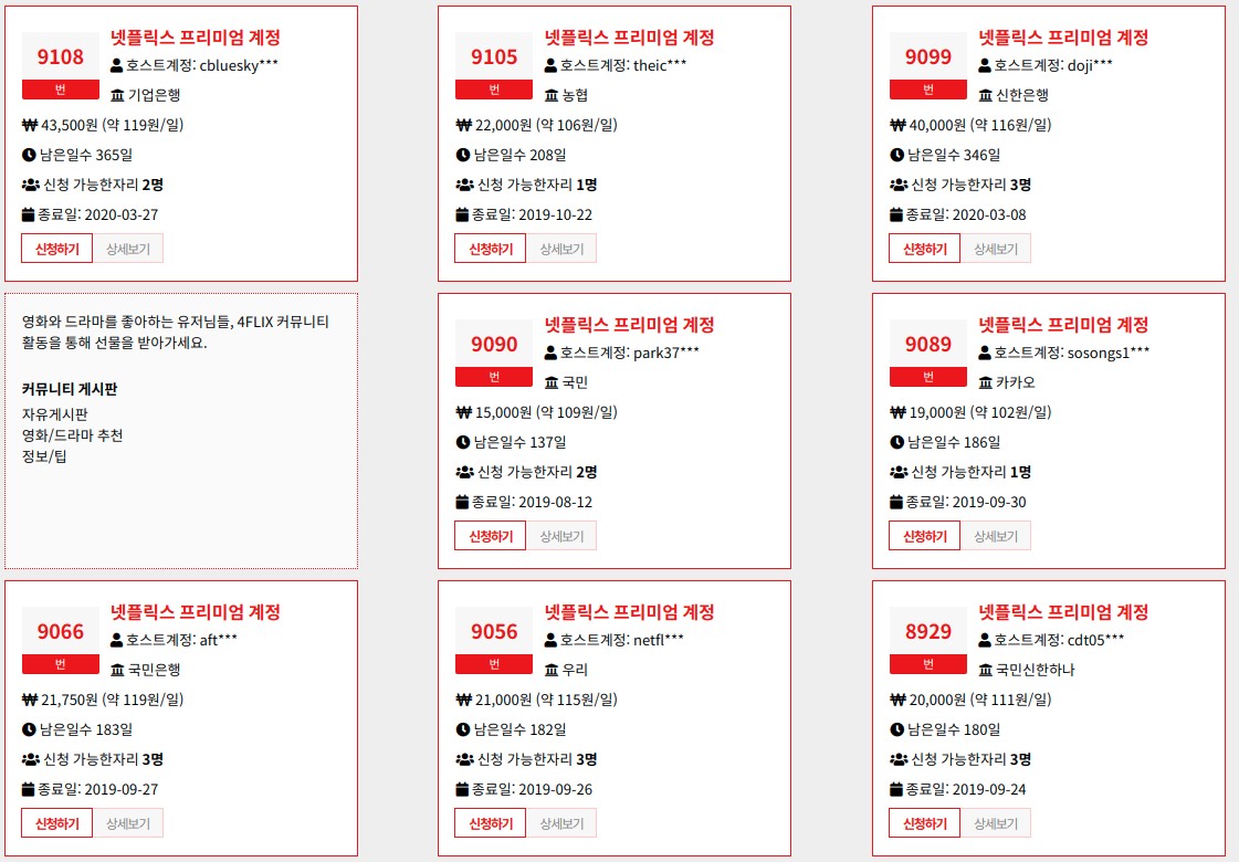 물론 사이트를 이용하기 위해서는 가입을 하셔야 하며, 가입 방법은 그리 어렵지 않으니 쉽게 가입을 할수 있을겁니다. 사이트 가입을 하신후에 메뉴에서 파티원 모집으로 들어 가시면 하단과 같이 같이 볼사람을 찾는 글을 많이 볼수가 있습니다. 이중에서 원하시는 신청 가능 자리가 남아 있는 파티에 들어가셔서 금액을 나눠서 실제로 넷플릭스에 가입을 하는 호스트에게 돈을 지불하고 해당 계정을 이용하면 됩니다.