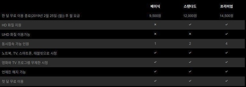 위 이미지를 보시면 현재 넷플릭스의 요금제가 어떻게 구성이 되어 있는지 한눈에 확인이 가능 한데요. 제일 비싼 프리미엄의 경우에는 동시 접속인원이 4명이고 UHD 급 화질로 이용이 가능합니다. 금액은 다소 비싼 14,500 원인데요. 여기에서 동시접속 가능 인원을 이용해서 넷플릭스 할인 받아서 볼수가 있습니다.