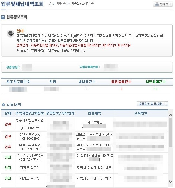 해제가 되었다면 해당압류건은 없는거라고 보시면 되고, 현재 상태가 압류로 되어 있는것들만 확인을 하시면 됩니다. 간혹 과태료등도 모두 냈는데도 불구하고 압류가 되어 있는 경우도 있을수 있는데요. 이경우에는 대부분 해당 담당자가 압류를 풀지 않아서 남아 있는 경우가 대부분입니다.
