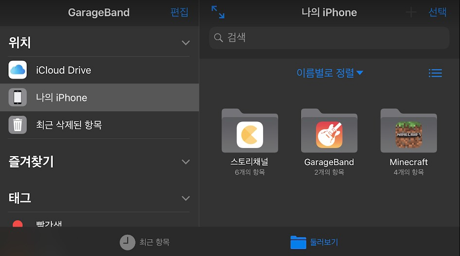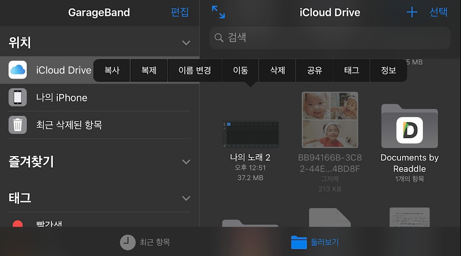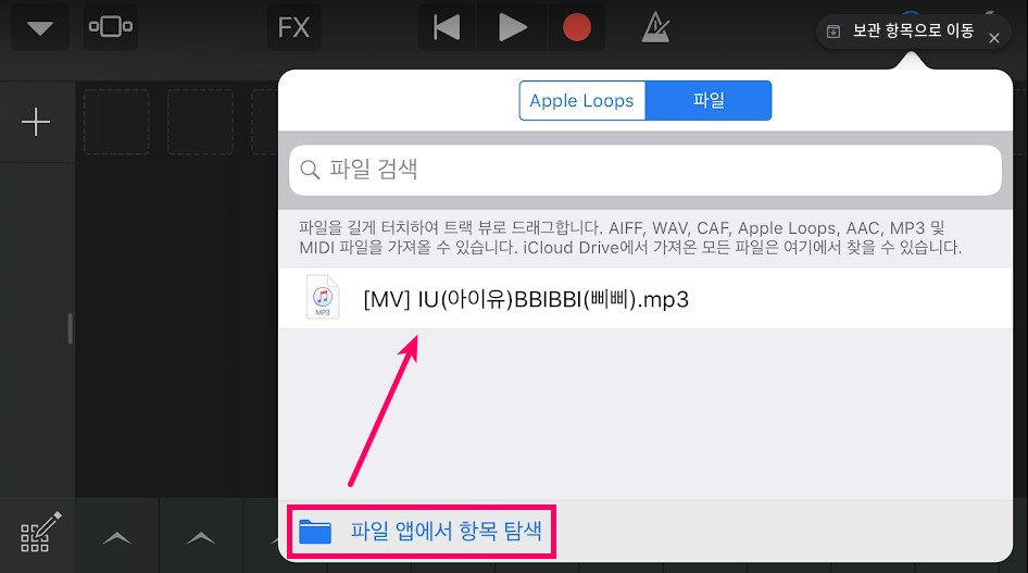 MP3 파일을 선태을 하기 위해서는 루프 추가에서 파일을 선택 하신후에 파일 앱에서 항목 탐색을 통해서 추가를 할수가 있습니다. 참고로 위에 말한 유튜브 영상을 MP3 로 변환하는 방법 이외에도 iCloud 에 mp3 를 업로드 해놓으시면 마찬가지로 파일앱에서 해당 MP3 파일을 개러지밴드에서 사용을 할수가 있습니다. 이 방법을 이용하셔도 간단하게 MP3 파일을 추가 할수 있어요.
