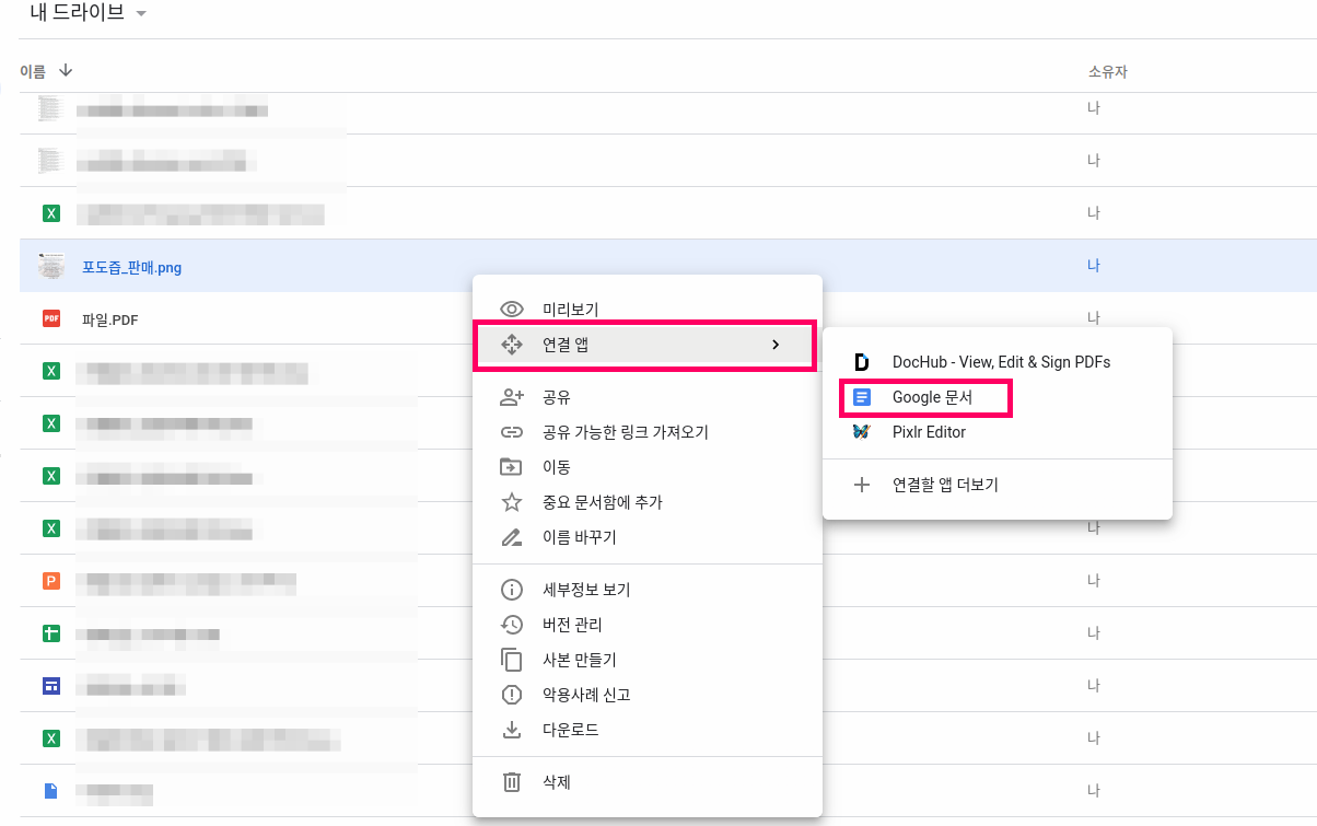 업로드가 완료가 되면 아래와 같이 해당 파일에서 마우스 오른쪽 버튼을 클릭해서 연결앱에 있는 "Google 문서" 를 이용해서 업로드한 문서 스캔 이미지를 열어 줍니다. 그러면 자동으로 OCR 기능을 이용해서 해당 이미지 뿐만아니라 변환된 문자도 같이 구글 문서를 통해서 확인을 할수가 있습니다.