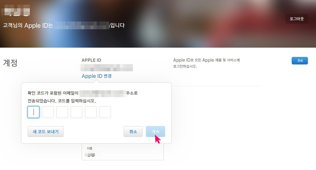 마지막에 한번더 확인을 위해서 사용하고 계시는 아이폰으로 이중인증 코드가 가게 되는데요. 해당 코드만 입력 하시면 완료 됩니다.