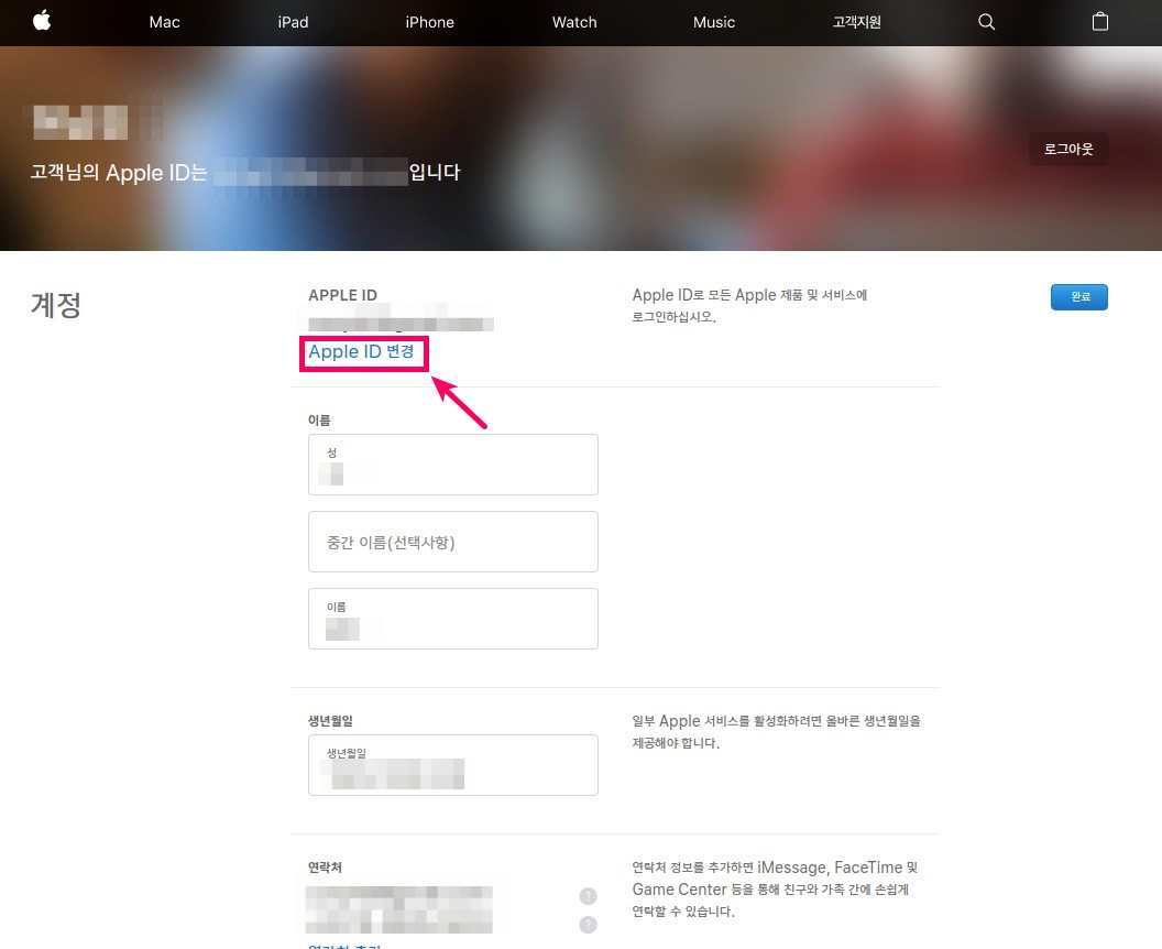 수정을 눌러 주시면 아래와 같이 "Apple ID 변경" 이라는 메뉴가 보이실겁니다. 해당 메뉴를 클릭 하시면 새로운 메일 주소를 애플 계정으로 사용을 할수가 있게 됩니다. 변경 하시기 전에 어떤 메일 주소를 이용하실지 잘 선택 하신후에 변경 하시면 될거 같네요.