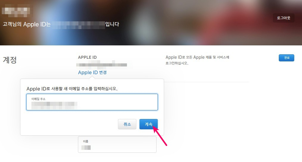 그러면 아래와 같이 Apple ID 로 사용할 이메일 주소를 입력을 하신후에 계속을 눌러 주시면 해당 이메일 주소로 애플 계정을 변경을 할수가 있습니다.
