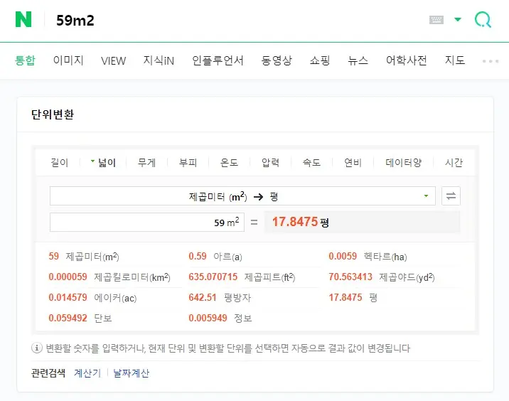 그렇다면 평과 제곱미터는 어떻게 계산을 할까요? 제일 간단한건 네이버에서 검색으로 계산 하는 방법입니다. 검색을 하시면 바로 원하시는 평 혹은 제곱미터의 값을 찾을수 있습니다.