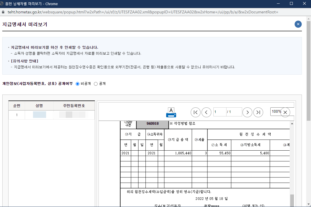 그러면 아래와 같이 원천징수영수증을 볼수가 있습니다. 원하신다면 인쇄버튼(프린터A 아이콘) 을 눌러서 인쇄를 할수가 있어요. PDF 로 인쇄를 하시거나, 직접 프린터로 인쇄를 하실수가 있습니다.