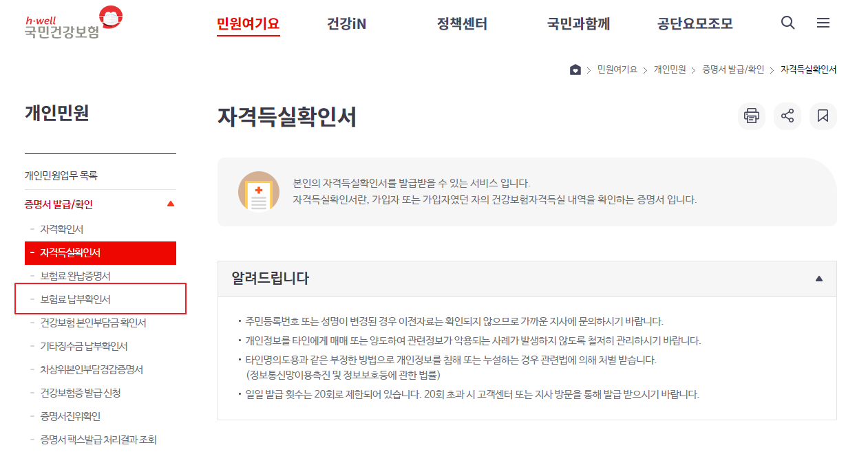 그러면 아래와 같은 화면이 나오게 되는데요. 왼쪽 메뉴에 증명서 발급/확인을 위한 여러개의 메뉴가 있습니다. 그중에서 "보험료 납부확인서" 를 클릭을 하시면 건강보험려납부내역서를 뽑아 볼수가 있습니다.