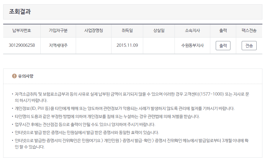 조회를 누르시면 아래와 같이 조회 결과가 나옵니다. 여기에서 출력을 선택을 해서 PDF 로 저장을 하거나 인쇄를 할수가 있습니다. 혹은 팩스전송을 통해서 팩스로 전송을 할수도 있습니다. 편하신 방법으로 출력을 하시면 될거 같아요.