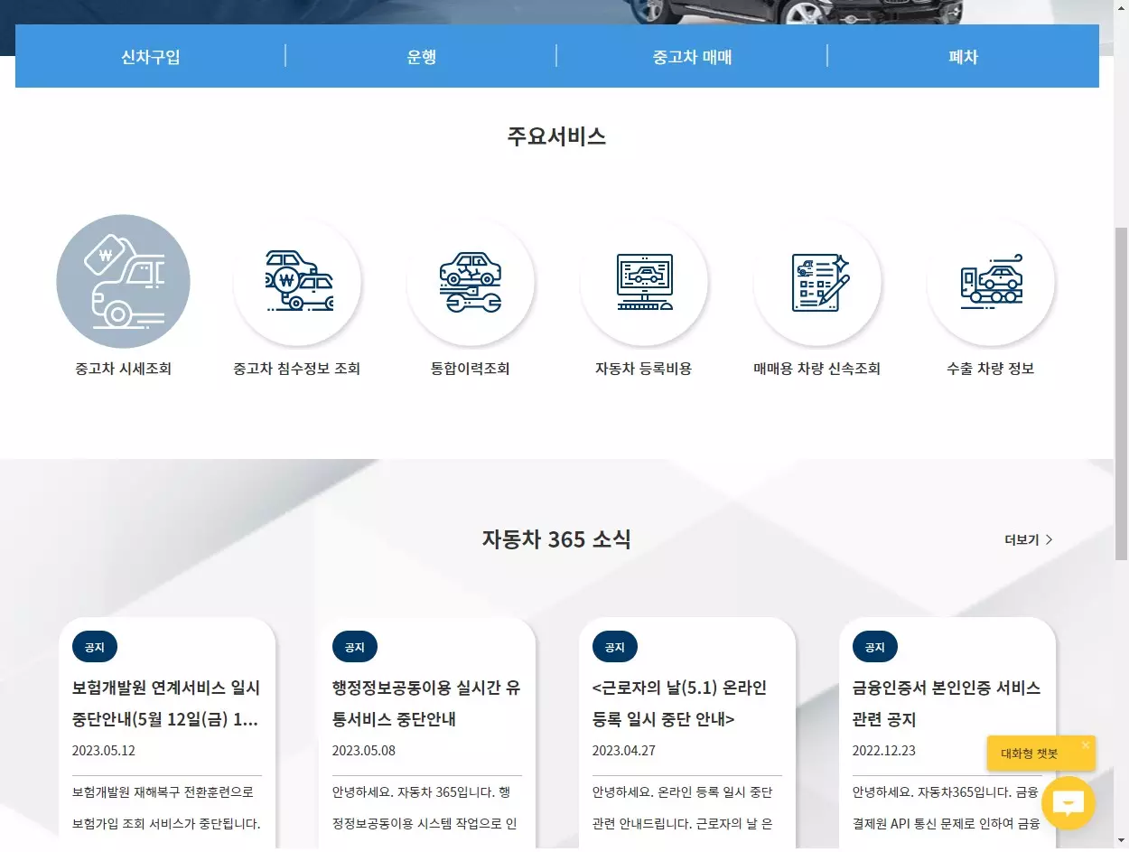 자동차365는 자동차와 관련된 자동차생애에 관련된 전반적인 내용을 확인하거나 업무를 볼수가 있습니다.